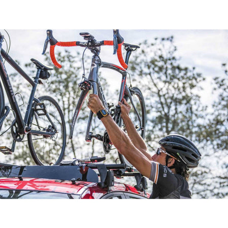 Experts agree, the ForkLift is the way to carry your bike. The fork-style roof rack bike mount fits nearly every crossbar right out of the box — no tools necessary. It keeps your bike pristine, not touching any painted surface.