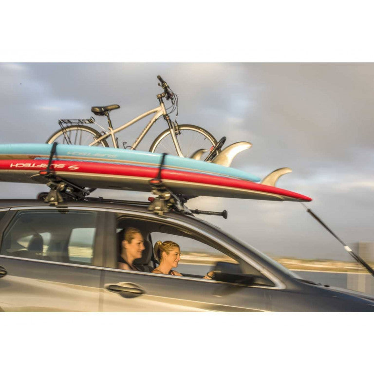 A stand up paddleboard mount which can hold up to two SUP Boards up to 92 cm wide. The SupDawg is fully assembled out-of-the-box, features integrated rollers for easy loading and includes SKS locks.