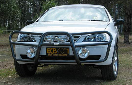 This ECB Type 8 Bar has been designed specifically for the Ford Falcon BA and will provide frontal protection and enhance the aesthetics of the vehicle. Designed and manufactured in Australia to suit our harsh conditions, this Type 8 Bar is designed to provide optimum protection for the bumper, grille and head lights and is formed from high tensile alloy tubing that will never rust or corrode. Each Type 8 Bar comes standard with spotlight mounting tabs. Our Type 8 Bars come with a lifetime warranty. Your ECB Type 8 Bar is available in a mirror finished polished alloy or choose from one of our low maintenance powder coat finishes.