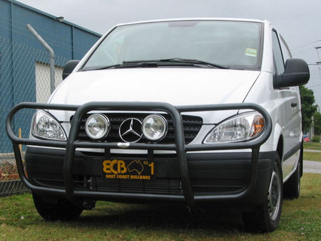 This ECB Roo Bar has been designed specifically for the Mercedes Vito and will provide frontal protection and enhance the aesthetics of the vehicle. Designed and manufactured in Australia to suit our harsh conditions, this Roo Bar Bar is designed to provide optimum protection for the bumper, grille and head lights and is formed from high tensile alloy tubing that will never rust or corrode. Each Roo Bar comes standard with spotlight mounting tabs. Our Roo Bars come with a lifetime warranty. Your ECB Roo Bar is available in a polished alloy finish or choose from one of our low maintenance powdercoat finishes.