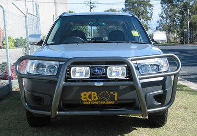 This ECB Roo Bar has been designed specifically for the Subaru Forester and will provide frontal protection and enhance the aesthetics of the vehicle. Designed and manufactured in Australia to suit our harsh conditions, this Roo Bar is designed to provide optimum protection for the bumper, grille and head lights and is formed from high tensile alloy tubing that will never rust or corrode. Each Roo Bar comes standard with spotlight mounting tabs. Our Roo Bars come with a lifetime warranty. Your ECB Roo Bar is available in a polished alloy finish or choose from one of our low maintenance powdercoat finishes.