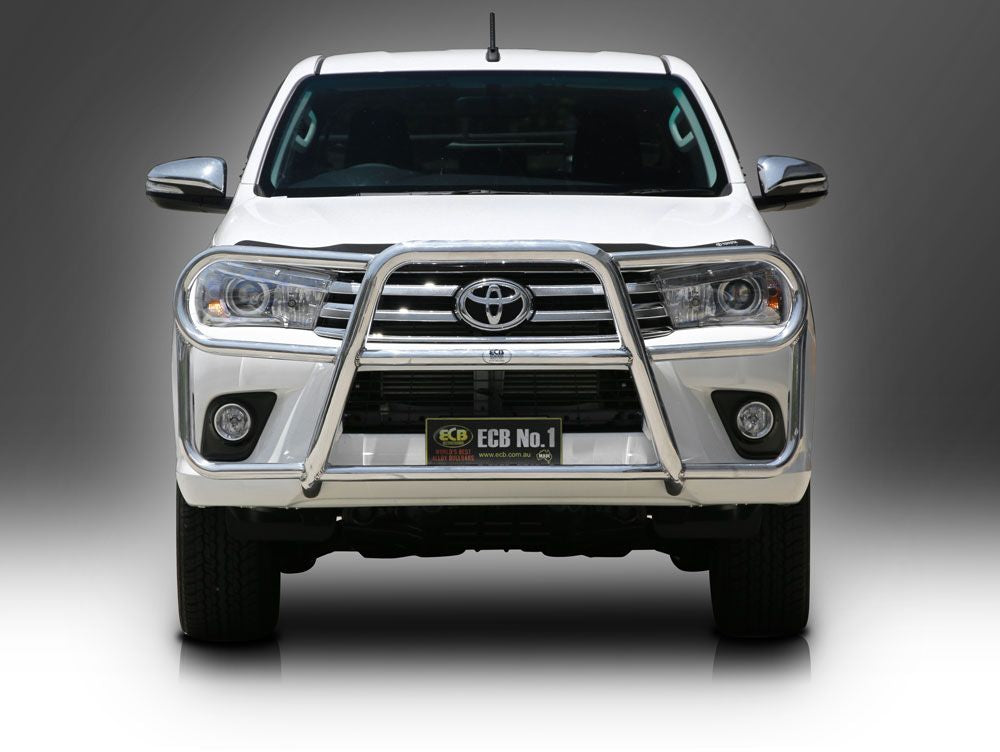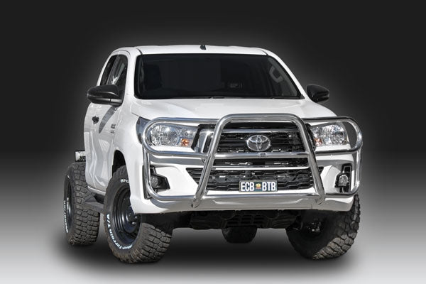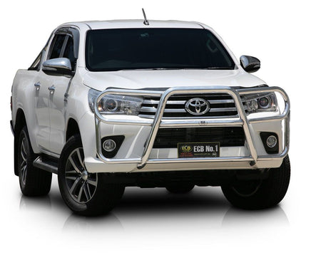 This ECB Roo Bar has been designed specifically for the Toyota HiLux and will provide frontal protection and enhance the aesthetics of the vehicle. Designed and manufactured in Australia to suit our harsh conditions, this Roo Bar is designed to provide optimum protection for the bumper, grille and head lights and is formed from high tensile alloy tubing that will never rust or corrode. Each Roo Bar comes standard with spotlight mounting tabs. Our Roo Bars come with a lifetime warranty. Your ECB Roo Bar is available in a polished alloy finish or choose from one of our low maintenance powdercoat finishes.