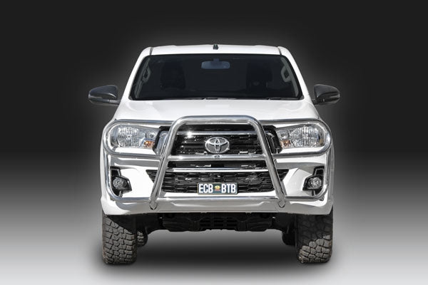 This ECB Roo Bar has been designed specifically for the Toyota HiLux and will provide frontal protection and enhance the aesthetics of the vehicle. Designed and manufactured in Australia to suit our harsh conditions, this Roo Bar is designed to provide optimum protection for the bumper, grille and head lights and is formed from high tensile alloy tubing that will never rust or corrode. Each Roo Bar comes standard with spotlight mounting tabs. Our Roo Bars come with a lifetime warranty. Your ECB Roo Bar is available in a polished alloy finish or choose from one of our low maintenance powdercoat finishes.