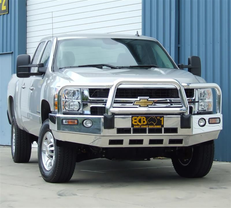 For the ultimate in frontal protection you will find it hard to go past the strength, quality and style of the ECB Bullbar for your Chevrolet Silverado 2500HD 4x4. The single piece channel is fully welded and manufactured from high tensile, structural grade alloys to provide maximum strength. Our Bullbar incorporates a full width, braced lower protection skirt and the specifically designed steel mounting system ensures a neat and sturdy fit. ECB LED light combinations, bumper lights, air directional cooling vents and an aerial bracket are all standard features. Your ECB Bullbar is available in a polished alloy finish or choose from one of our low maintenance powdercoat finishes. Our ECB Bullbar is proudly manufactured in Australia and we offer a lifetime warranty.