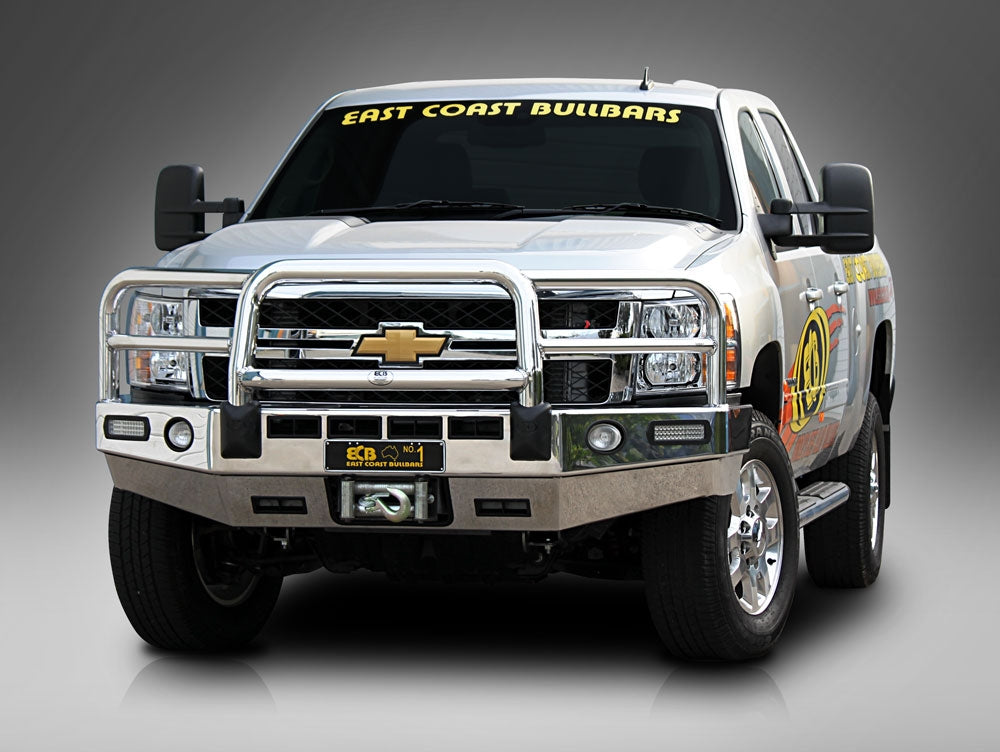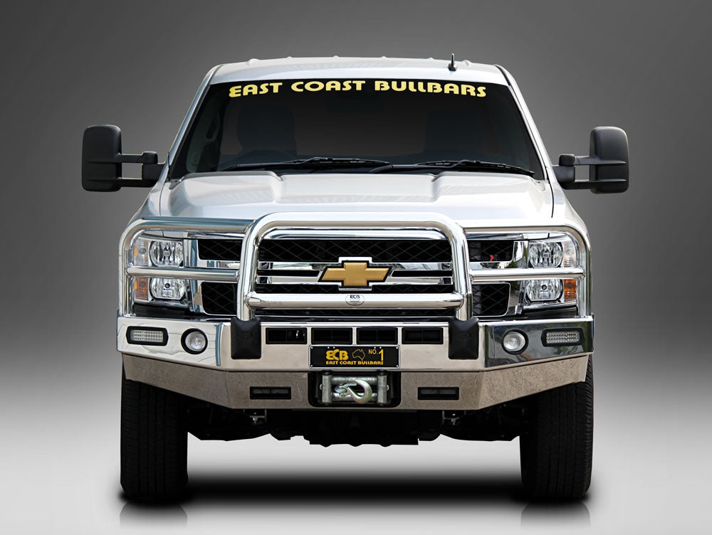 For the ultimate in frontal protection you will find it hard to go past the strength, quality and style of the ECB Winch Compatible Bullbar for your Chevrolet Silverado 2500HD 4x4. The single piece channel is fully welded and manufactured from high tensile, structural grade alloys to provide maximum strength. This no compromise design is engineered to accommodate up to a 10,500lb low mount winch that is attached to the chassis as part of the specifically designed steel mounting system ensuring a neat and sturdy fit. Our Winch Compatible Bullbar incorporates a full width, braced lower protection skirt. ECB LED light combinations, bumper lights, air directional cooling vents and an aerial bracket are all standard features. Your ECB Winch Compatible Bullbar is available in a polished alloy finish or choose from one of our low maintenance powdercoat finishes. Our ECB Winch Compatible Bullbar is proudly manufactured in Australia and we offer a lifetime warranty.