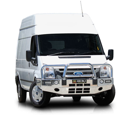 For the ultimate in frontal protection you will find it hard to go past the strength, quality and style of the ECB Bullbar for your Ford Transit VM. The single piece channel is fully welded and manufactured from high tensile, structural grade alloys to provide maximum strength. Our Bullbar incorporates a full width, braced lower protection skirt and the specifically designed steel mounting system ensures a neat and sturdy fit. ECB LED light combinations, bumper lights, air directional cooling vents and an aerial bracket are all standard features. Your ECB Bullbar is available in a polished alloy finish or choose from one of our low maintenance powdercoat finishes. Our ECB Bullbar is proudly manufactured in Australia and we offer a lifetime warranty.