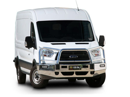 For the ultimate in frontal protection you will find it hard to go past the strength, quality and style of the ECB Bullbar for your Ford Transit VO. The single piece channel is fully welded and manufactured from high tensile, structural grade alloys to provide maximum strength. Our Bullbar incorporates a full width, braced lower protection skirt and the specifically designed steel mounting system ensures a neat and sturdy fit. ECB LED light combinations, air directional cooling vents and an aerial bracket are all standard features. Your ECB Bullbar is available in a polished alloy finish or choose from one of our low maintenance powdercoat finishes. Our ECB Bullbar is proudly manufactured in Australia and we offer a lifetime warranty.