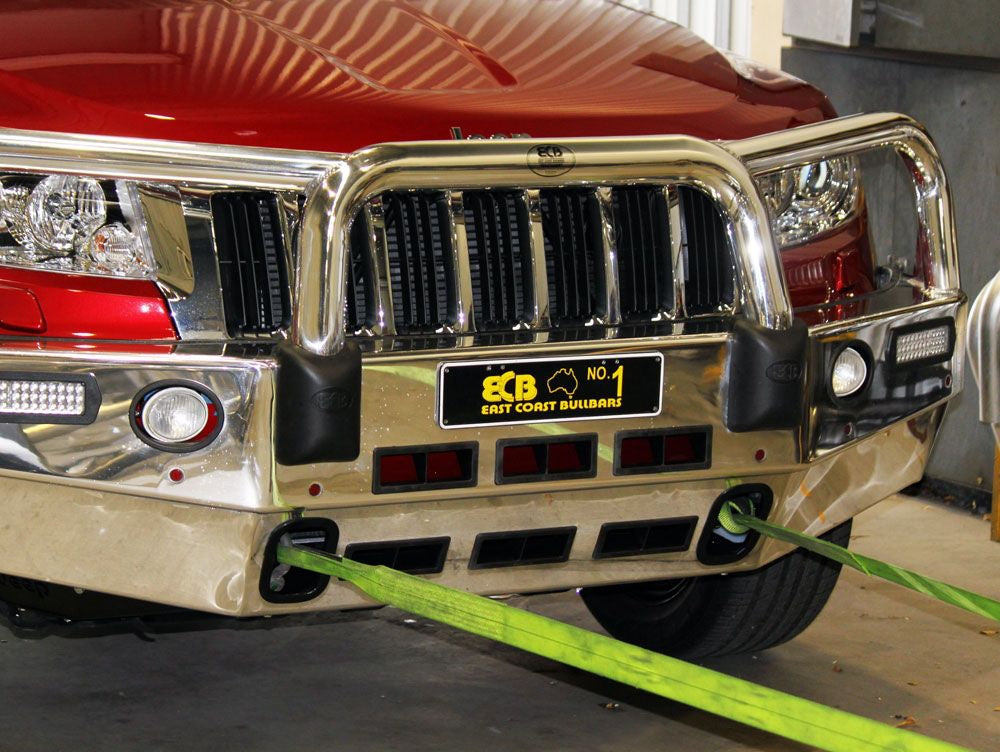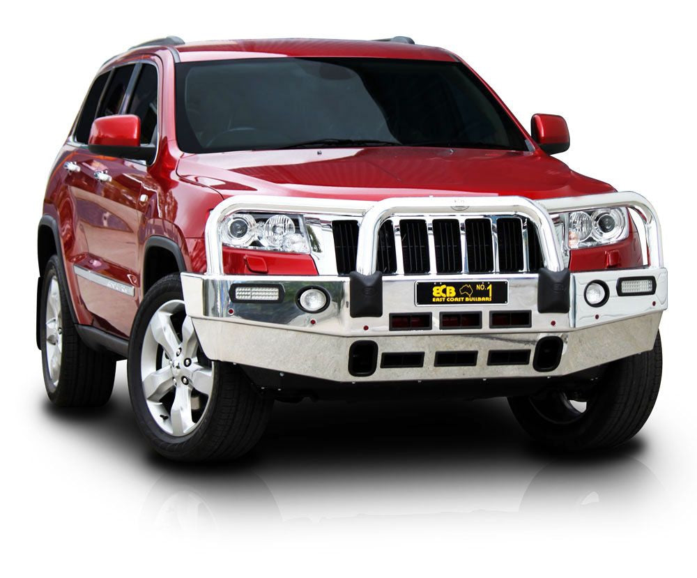 For the ultimate in frontal protection you will find it hard to go past the strength, quality and style of the ECB Bullbar for your Jeep Grand Cherokee MY11. The single piece channel is fully welded and manufactured from high tensile, structural grade alloys to provide maximum strength. Our Bullbar incorporates a full width, braced lower protection skirt and the specifically designed steel mounting system ensures a neat and sturdy fit. ECB LED light combinations, bumper lights, air directional cooling vents and an aerial bracket are all standard features. Your ECB Bullbar is available in a polished alloy finish or choose from one of our low maintenance powdercoat finishes. Our ECB Bullbar is proudly manufactured in Australia and we offer a lifetime warranty.