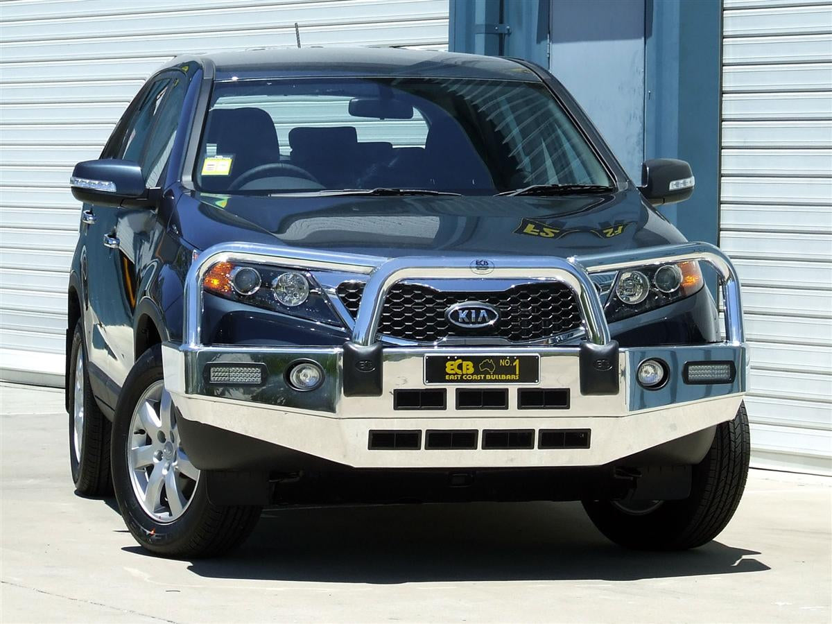 For the ultimate in frontal protection you will find it hard to go past the strength, quality and style of the ECB Bullbar for your Kia Sorento. The single piece channel is fully welded and manufactured from high tensile, structural grade alloys to provide maximum strength. Our Bullbar incorporates a full width, braced lower protection skirt and the specifically designed steel mounting system ensures a neat and sturdy fit. ECB LED light combinations, bumper lights, air directional cooling vents and an aerial bracket are all standard features. Your ECB Bullbar is available in a polished alloy finish or choose from one of our low maintenance powdercoat finishes. Our ECB Bullbar is proudly manufactured in Australia and we offer a lifetime warranty.