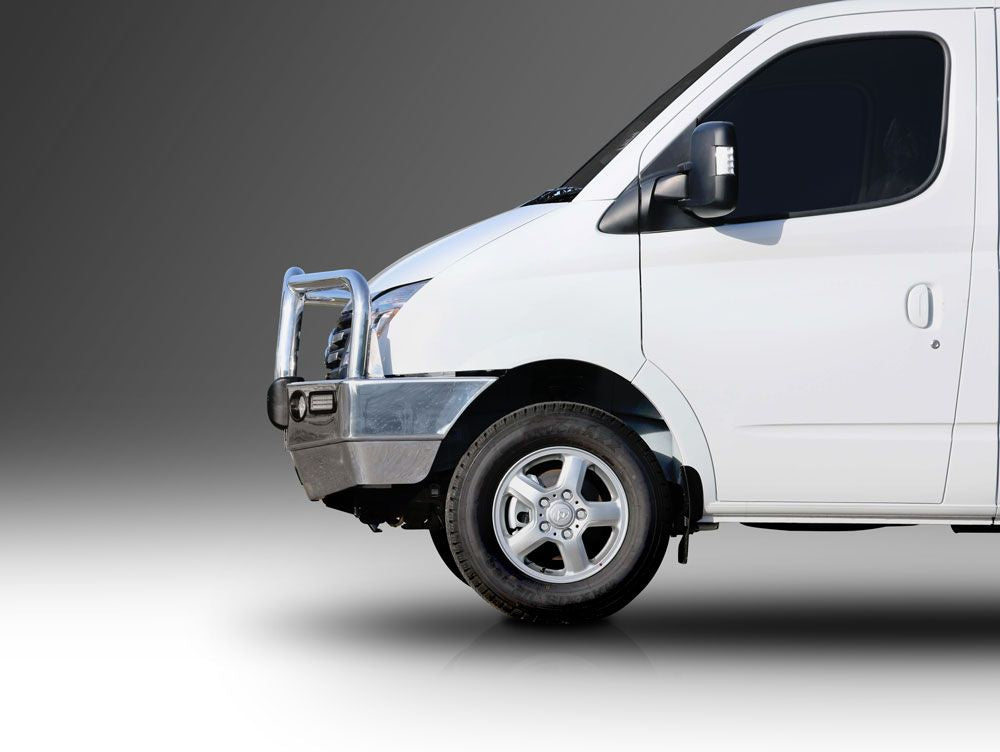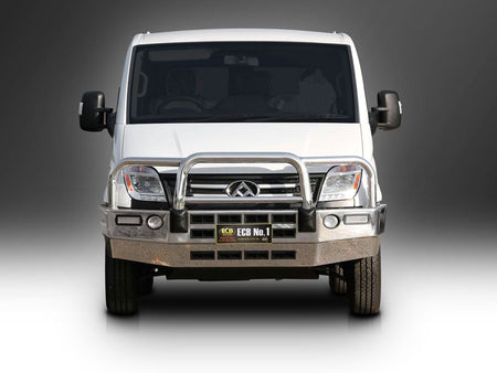 For the ultimate in frontal protection you will find it hard to go past the strength, quality and style of the ECB Bullbar for your LDV V80. The single piece channel is fully welded and manufactured from high tensile, structural grade alloys to provide maximum strength. Our Bullbar incorporates a full width, braced lower protection skirt and the specifically designed steel mounting system ensures a neat and sturdy fit. ECB LED light combinations, air directional cooling vents and an aerial bracket are all standard features. Your ECB Bullbar is available in a polished alloy finish or choose from one of our low maintenance powdercoat finishes. Our ECB Bullbar is proudly manufactured in Australia and we offer a lifetime warranty.