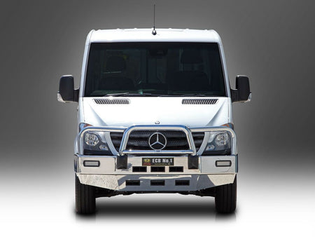 For the ultimate in frontal protection you will find it hard to go past the strength, quality and style of the ECB Alloy Bullbar for your Mercedes Sprinter. The single piece channel is fully welded and manufactured from high tensile, structural grade alloys to provide maximum strength.Our Bullbar incorporates a full width, braced lower protection skirt and the specifically designed steel mounting system ensures a neat and sturdy fit. ECB LED light combinations, air directional cooling vents and an aerial bracket are all standard features. Your ECB Bullbar is available in a polished alloy finish or choose from one of our low maintenance powdercoat finishes. Our ECB Bullbar is proudly manufactured in Australia and we offer a lifetime warranty.