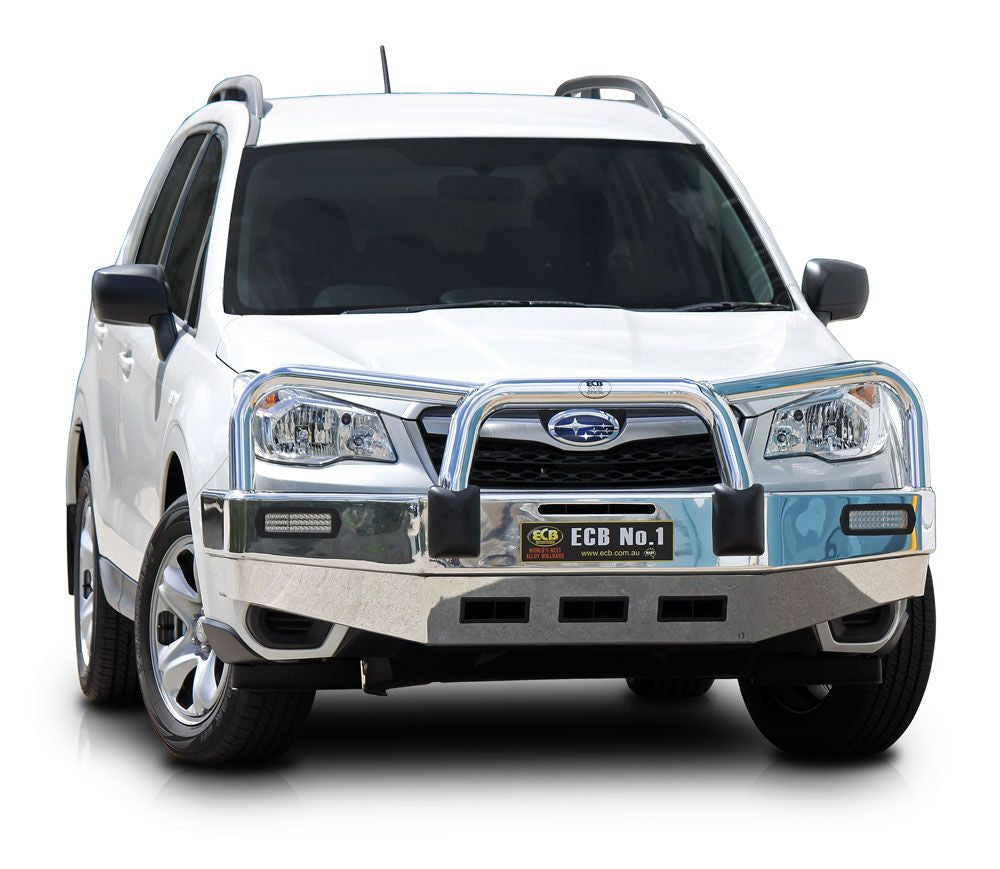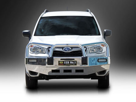 For the ultimate in frontal protection you will find it hard to go past the strength, quality and style of the ECB Bullbar for your Subaru Forester MY13. The single piece channel is fully welded and manufactured from high tensile, structural grade alloys to provide maximum strength. Our Bullbar incorporates a full width, braced lower protection skirt and the specifically designed steel mounting system ensures a neat and sturdy fit. ECB LED light combinations, air directional cooling vents and an aerial bracket are all standard features. Your ECB Bullbar is available in a polished alloy finish or choose from one of our low maintenance powdercoat finishes. Our ECB Bullbar is proudly manufactured in Australia and we offer a lifetime warranty.