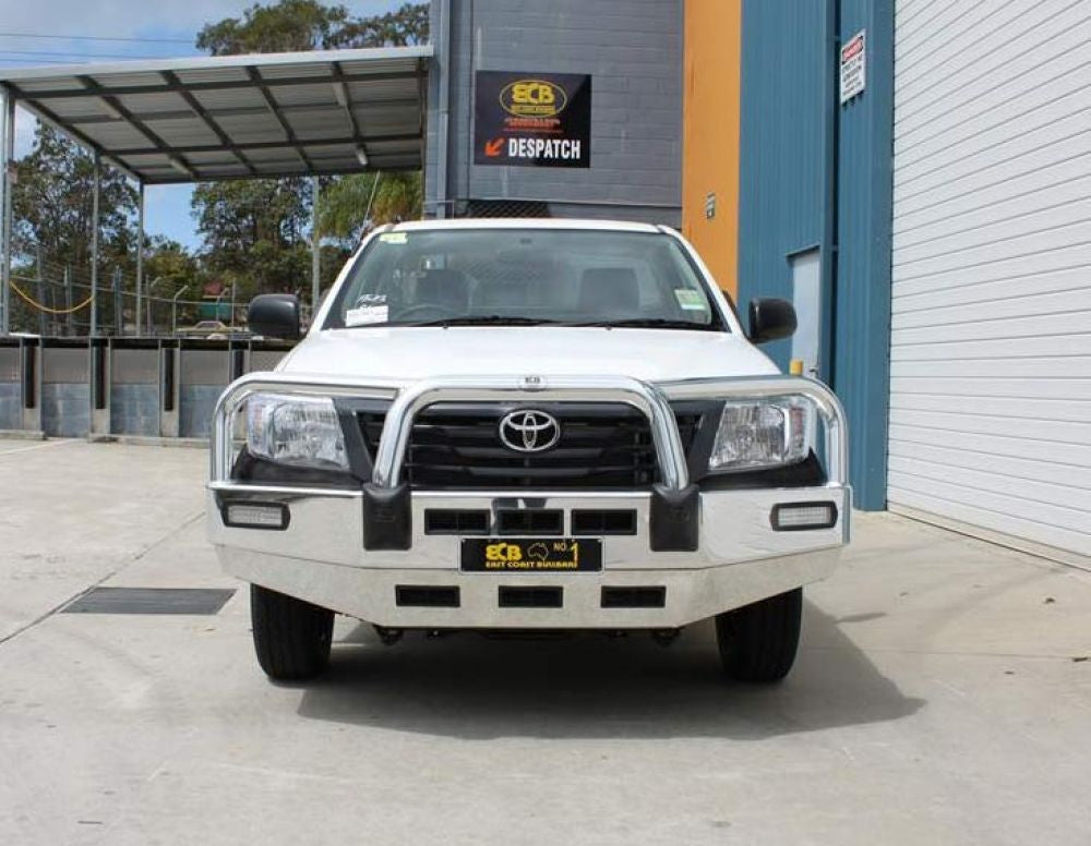For the ultimate in frontal protection you will find it hard to go past the strength, quality and style of the ECB Alloy Bullbar for your Toyota HiLux 2WD/4WD. The single piece channel is fully welded and manufactured from high tensile, structural grade alloys to provide maximum strength. Our Bullbar incorporates a full width, braced lower protection skirt and the specifically designed steel mounting system ensures a neat and sturdy fit. ECB LED light combinations, air directional cooling vents and an aerial bracket are all standard features. Your ECB Bullbar is available in a polished alloy finish or choose from one of our low maintenance powdercoat finishes. Our ECB Bullbar is proudly manufactured in Australia and we offer a lifetime warranty.