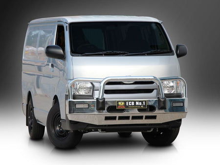 For the ultimate in frontal protection you will find it hard to go past the strength, quality and style of the ECB Alloy Bullbar for your Toyota Hiace MWB/LWB. The single piece channel is fully welded and manufactured from high tensile, structural grade alloys to provide maximum strength. Our Bullbar incorporates a full width, braced lower protection skirt and the specifically designed steel mounting system ensures a neat and sturdy fit. ECB LED light combinations, air directional cooling vents and an aerial bracket are all standard features. Your ECB Bullbar is available in a polished alloy finish or choose from one of our low maintenance powdercoat finishes. Our ECB Bullbar is proudly manufactured in Australia and we offer a lifetime warranty.
