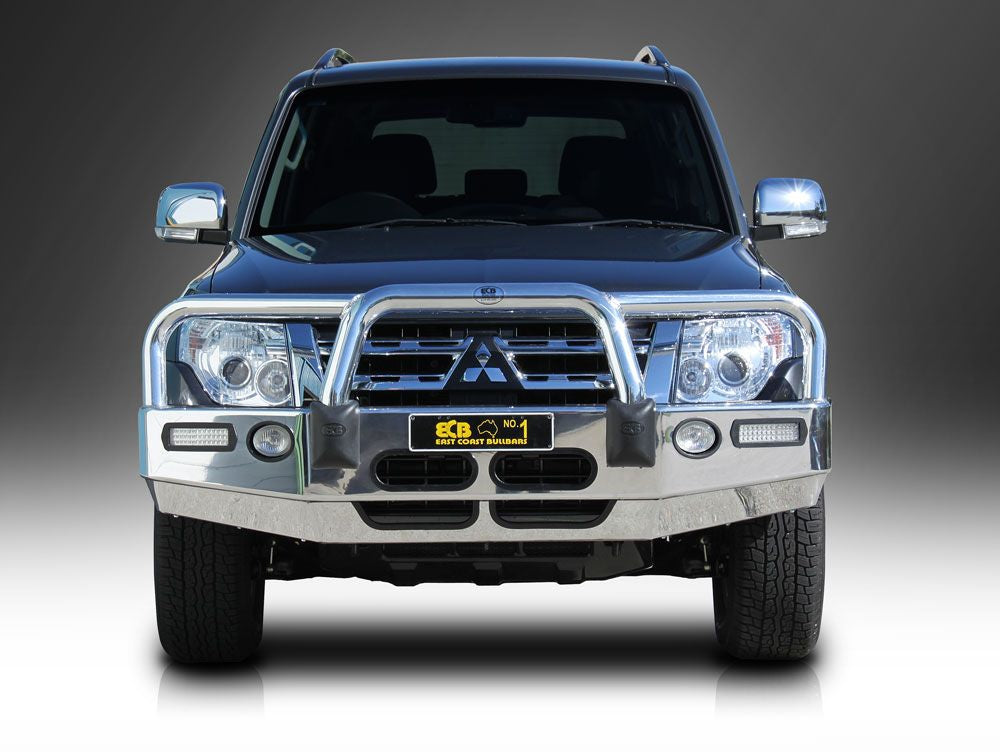 For the ultimate in frontal protection you will find it hard to go past the strength, quality and style of the ECB Bullbar for your Mitsubishi Pajero NW GLS. The single piece channel is fully welded and manufactured from high tensile, structural grade alloys to provide maximum strength. Our Bullbar incorporates a full width, braced lower protection skirt and the specifically designed steel mounting system ensures a neat and sturdy fit. ECB LED light combinations, bumper lights, air directional cooling vents and an aerial bracket are all standard features. Your ECB Bullbar is available in a polished alloy finish or choose from one of our low maintenance powdercoat finishes. Our ECB Bullbar is proudly manufactured in Australia and we offer a lifetime warranty.