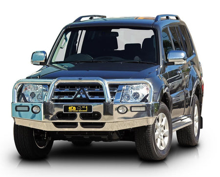 For the ultimate in frontal protection you will find it hard to go past the strength, quality and style of the ECB Bullbar for your Mitsubishi Pajero NW GLS. The single piece channel is fully welded and manufactured from high tensile, structural grade alloys to provide maximum strength. Our Bullbar incorporates a full width, braced lower protection skirt and the specifically designed steel mounting system ensures a neat and sturdy fit. ECB LED light combinations, bumper lights, air directional cooling vents and an aerial bracket are all standard features. Your ECB Bullbar is available in a polished alloy finish or choose from one of our low maintenance powdercoat finishes. Our ECB Bullbar is proudly manufactured in Australia and we offer a lifetime warranty.