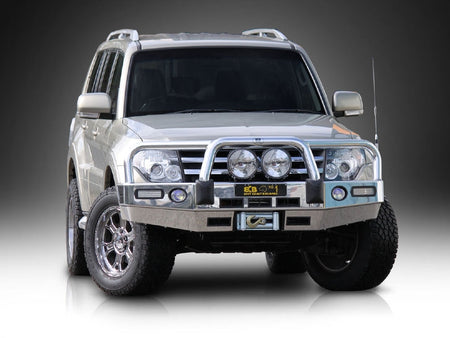 For the ultimate in frontal protection you will find it hard to go past the strength, quality and style of the ECB Alloy Winch Bullbar with Bumper Lights for your Mitsubishi Pajero NX. The single piece channel is fully welded and manufactured from high tensile, structural grade alloys to provide maximum strength. This no compromise design is engineered to accommodate up to a 10,500lb low mount winch that is attached to the chassis as part of the specifically designed steel mounting system ensuring a neat and sturdy fit. Our Winch Compatible Winch Bullbar with Bumper Lights incorporates a full width, braced lower protection skirt. ECB LED light combinations, bumper lights, air directional cooling vents and an aerial bracket are all standard features. Your ECB Winch Bullbar with Bumper Lights is available in a polished alloy finish or choose from one of our low maintenance powdercoat finishes. Our ECB Winch Bullbar with Bumper Lights is proudly manufactured in Australia and we offer a lifetime warranty.