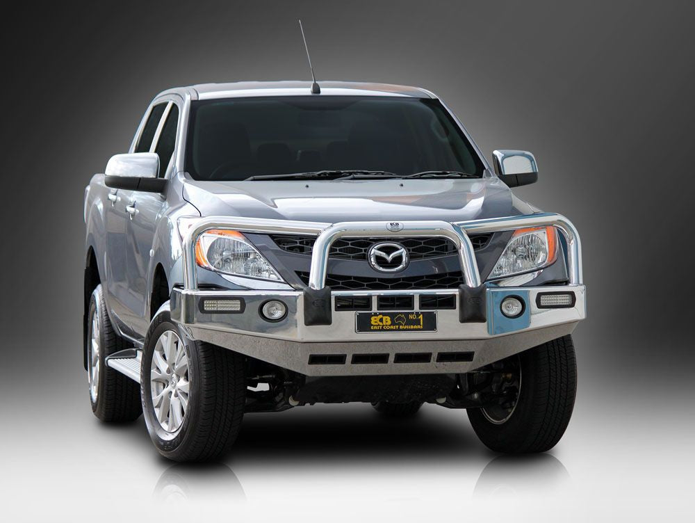 For the ultimate in frontal protection you will find it hard to go past the strength, quality and style of the ECB Alloy Bullbar with Bumper Lights for your Mazda BT-50. The single piece channel is fully welded and manufactured from high tensile, structural grade alloys to provide maximum strength. Our Bullbar with Bumper Lights incorporates a full width, braced lower protection skirt and the specifically designed steel mounting system ensures a neat and sturdy fit. ECB LED light combinations, bumper lights, air directional cooling vents and an aerial bracket are all standard features. Your ECB Bullbar with Bumper Lights is available in a polished alloy finish or choose from one of our low maintenance powdercoat finishes. Our ECB Bullbar with Bumper Lights is proudly manufactured in Australia and we offer a lifetime warranty.
