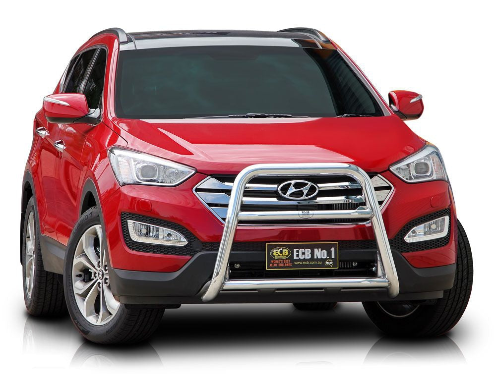 This ECB Series 2 Nudge Bar has been designed specifically for the Hyundai Santa-Fe and will provide frontal protection and enhance the aesthetics of the vehicle. Designed and manufactured in Australia to suit our harsh conditions, this Series 2 Nudge Bar is designed with a lower centre tube to provide bumper and grille protection and is formed from high tensile alloy tubing that will never rust or corrode. Each Series 2 Nudge Bar comes standard with spotlight mounting tabs. Our Series 2 Nudge Bars are built stronger and substantially lighter than poorer quality, thinner sectioned imported stainless steel alternatives and come with a lifetime warranty. Your ECB Series 2 Nudge Bar is available in a polished alloy finish or choose from one of our low maintenance powdercoat finishes.
