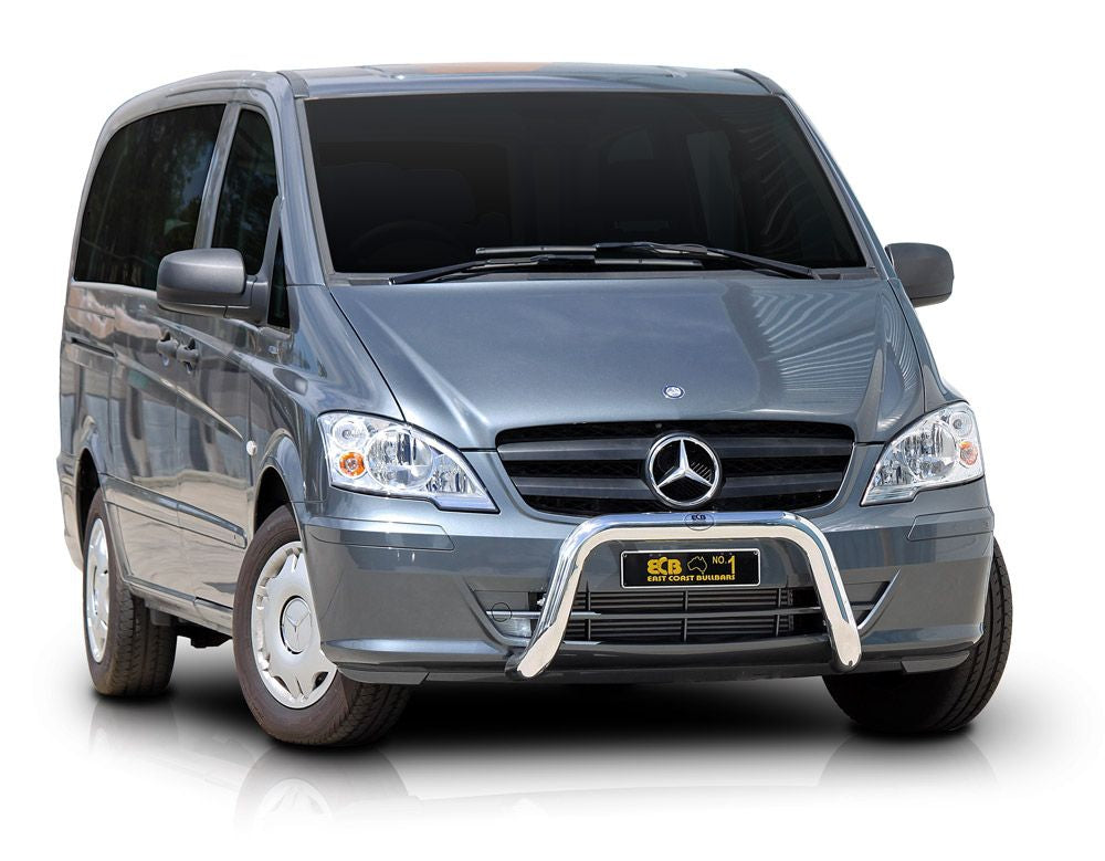 This ECB Nudge Bar has been designed specifically for the Mercedes Vito and will provide frontal protection and enhance the aesthetics of the vehicle. Designed and manufactured in Australia to suit our harsh conditions, this Nudge Bar is formed from high tensile alloy tubing that will never rust or corrode. Each Nudge Bar comes standard with spotlight mounting tabs. Our Nudge Bars are built stronger and substantially lighter than poorer quality, thinner sectioned imported stainless steel alternatives and come with a lifetime warranty. Your ECB Nudge Bar is available in a polished alloy finish or choose from one of our low maintenance powdercoat finishes.