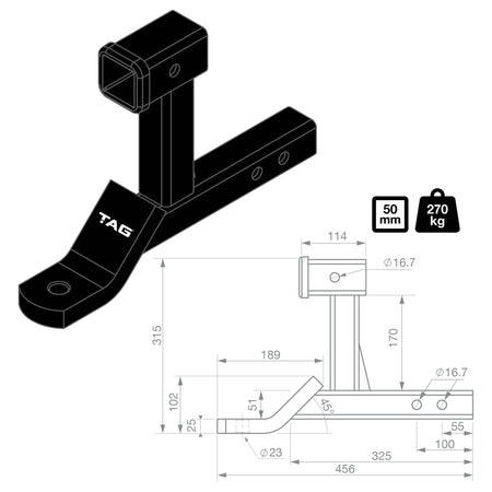 TAG Dual Use Tow Ball Mount - 50mm Square Hitch